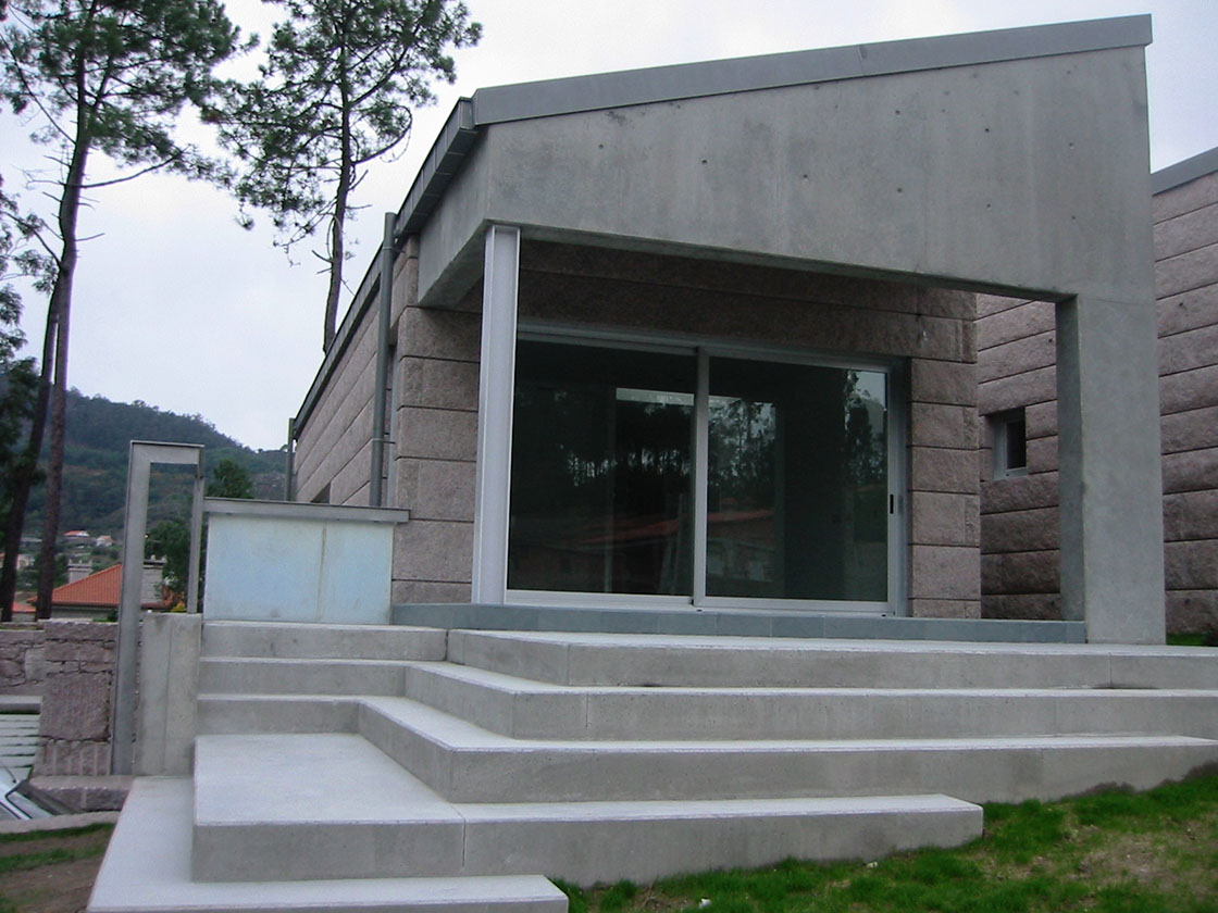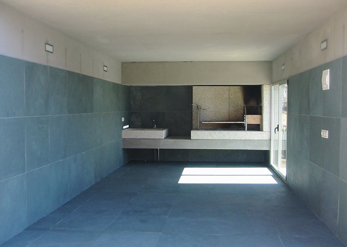 La vivienda, de planta baja con sótano subterráneo, se estructura en de dos alas separadas que alojan dormitorios a un lado y salón con cocina-comedor al lado opuesto. En el entorno de la piscina, se emplaza un asador de hormigón visto y pizarra.